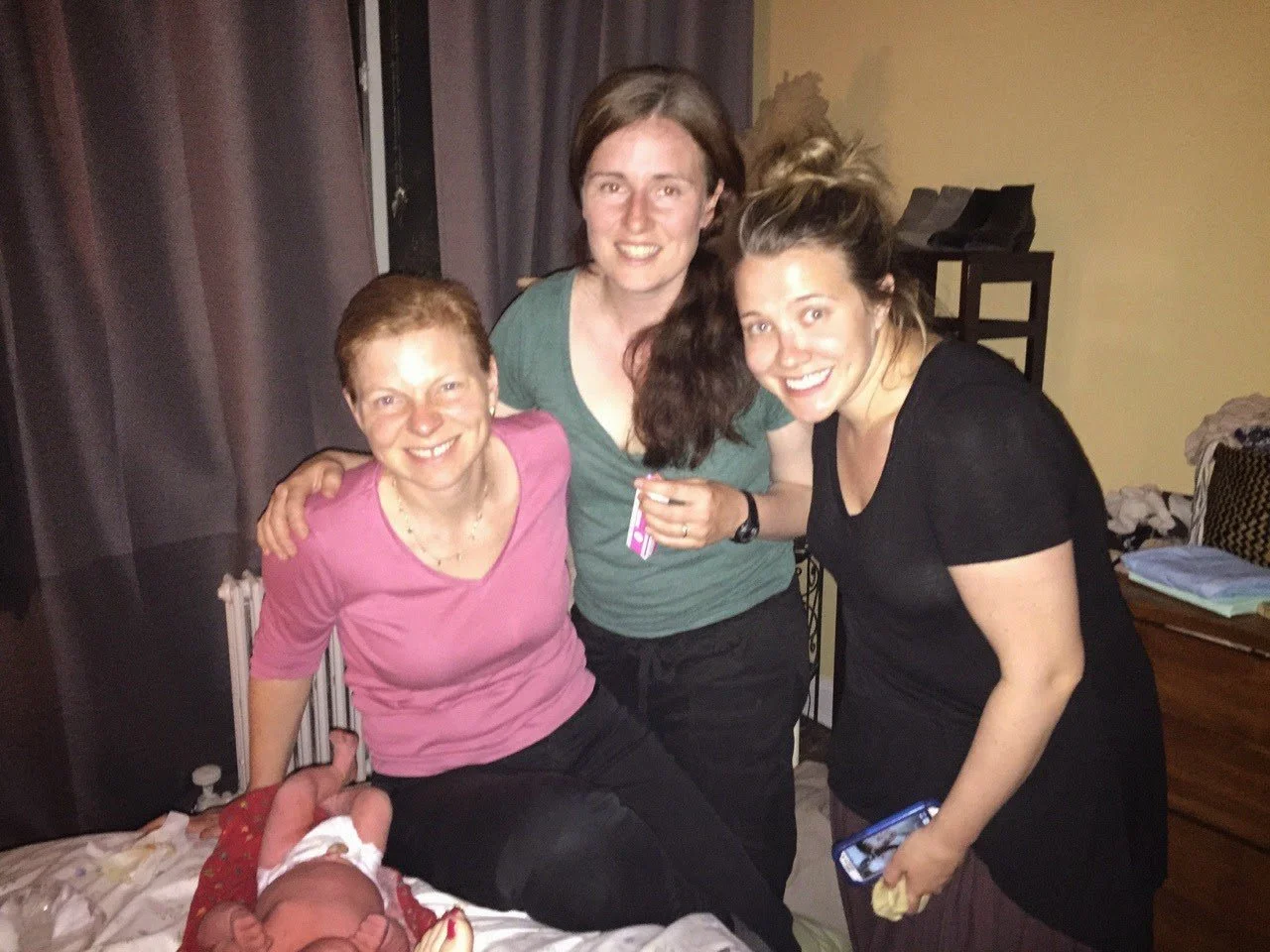 Kelly with two midwives in NYC after a home birth 2015, Kelly Belly Birth